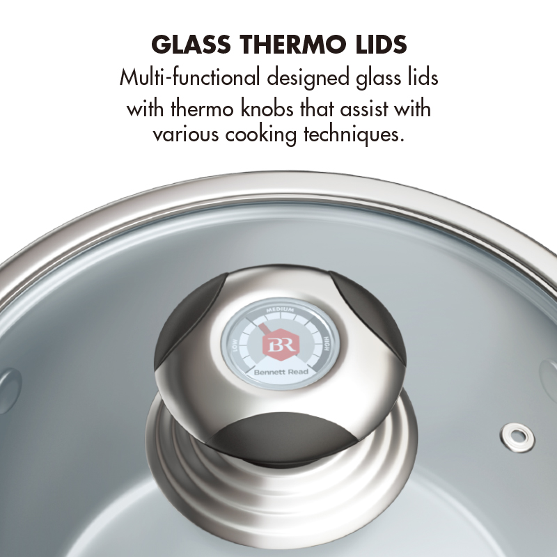 The Bennett Read Finesse 16 is a 16-piece, premium Stainless Steel cookware set with a heavy duty base for unmatched heat distribution in its class. This premium stainless steel cookware set includes multi-functional designed glass lids with thermo knobs that assist with various cooking techniques. Its thick stepped base distributes heat evenly for an exceptional and efficient cooking experience and the ergonomic cool-touch handles are convenient and easy to handle when multitasking in the kitchen. The Bennett Read Cuisine Finesse 16 pot set includes 1 x 16cm sauce pan and glass lid, 1 x 16cm casserole pot and glass lid, 1 x 20cm casserole pot, 1 x 24cm casserole pot, 1 x 24cm deep frying pan and 7 utensils.